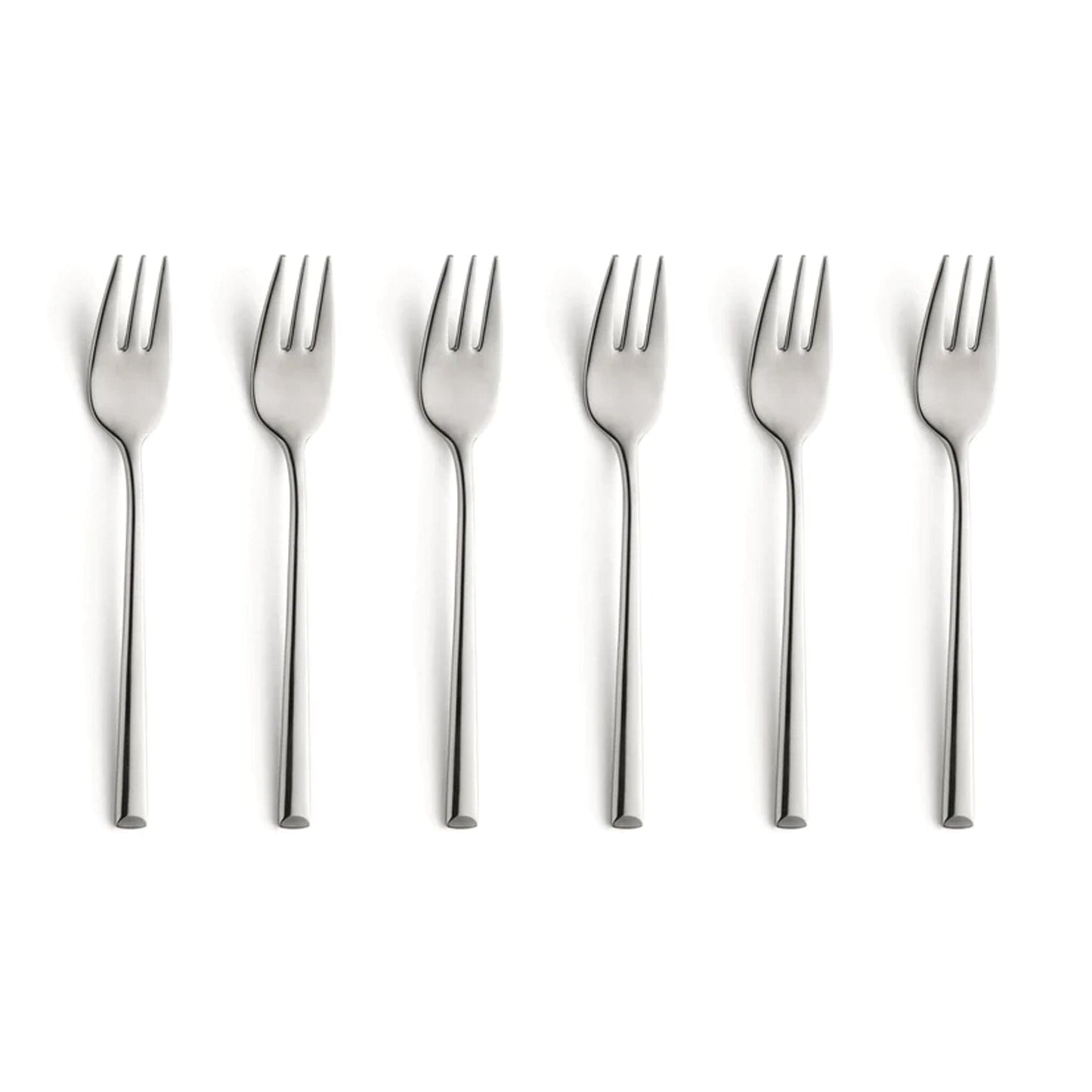 Ce set de fourchettes à pâtisserie Métropole de la marque Amefa est un magnifique set de fourchettes à pâtisserie intemporel. L'ensemble a un design fin et élégant, avec une poignée inclinée en bas. Ce design s'inspire de l'architecture urbaine moderne et présente un look luxueux et contemporain fabriqué en acier inoxydable 18-10 de haute qualité. Les couverts ont une finition brillante et peuvent être nettoyés au lave-vaisselle.
