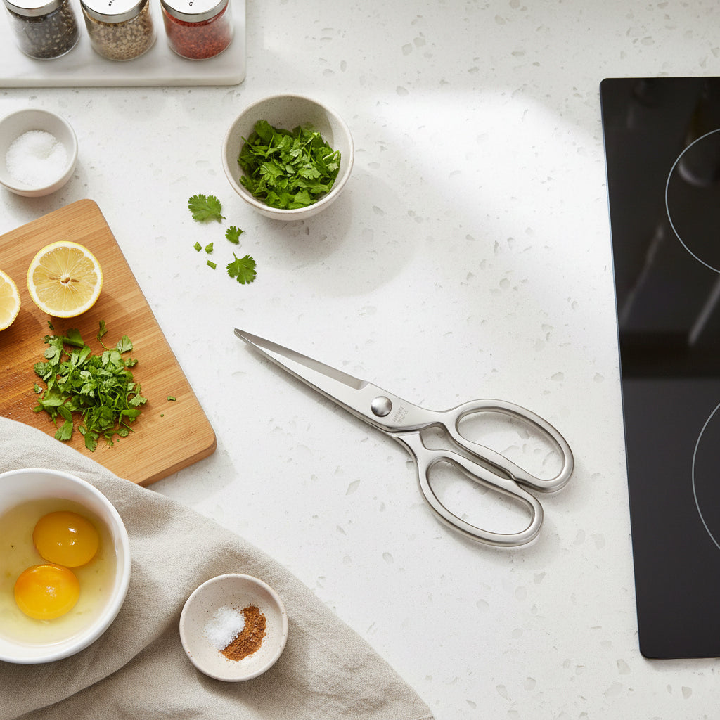 Les ciseaux de cuisine classiques haut de gamme Shinrai Knives sont polyvalents et performants, parfaits pour les chefs professionnels comme pour les cuisiniers amateurs passionnés. Grâce à leur lame ultra-tranchante, ils permettent de couper sans effort aussi bien les matières organiques que non organiques. Des herbes aromatiques aux emballages, en passant par la volaille, ces ciseaux s'adaptent à toutes les situations. Leur conception de haute qualité est renforcée par une lame micro-dentelée qui offre une meilleure prise en main et empêche les aliments de glisser pendant la découpe.