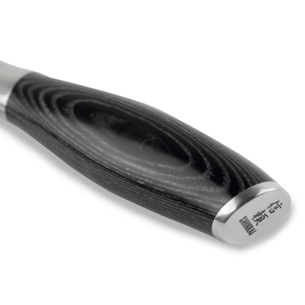 Cette édition de la série Damast Pakka Wood a été finie avec une grande précision. La lame en acier damassé japonais se poursuit dans la magnifique mitre en acier. Le bois du manche est en bois de pakka durable. Les anses sont légèrement bombées et courbées. Cela rend les poignées confortables à tenir. Un beau détail est le logo Shinrai Japan au bout du manche. Un beau couteau avec une prise en main parfaite.