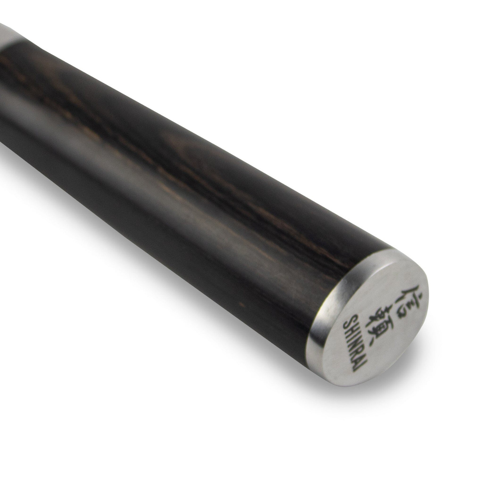 La lame en acier damassé martelée à la main se prolonge dans un magnifique manche en bois de pakka. La lame est martelée à la main à la japonaise. La poignée tient très bien dans la main, aussi bien pour les gauchers que pour les droitiers. Un beau détail est le logo Shinrai Japan au bout du manche. Un beau couteau avec une prise en main parfaite.