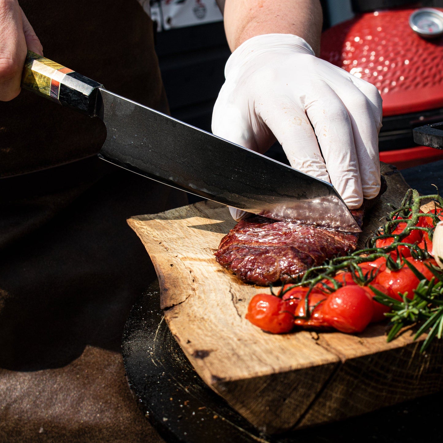 The Special Edition - 7 Layers Damask - Kiritsuke knife from Shinrai Knives is designed as a versatile knife for preparing Asian dishes. This is done by combining the blade of a nakiri (vegetable knife) and sujihiki (fish knife). The inverted tanto profile of the kiritsuke makes the point highly maneuverable for fine carving, but also vulnerable. This knife is therefore not suitable for cutting bones and bones. This knife is not only functional, but also a real eye-catcher in your kitchen due to the uniquely finished handle.