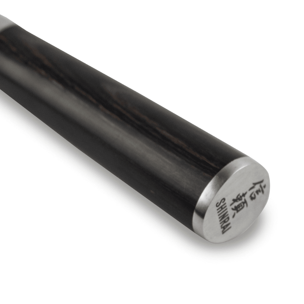 This edition of the Damast Pakka Wood Series is finished to perfection. The Japanese damask steel blade continues into the beautiful steel bolster. The wood of the handle is made of sustainable pakka wood. The handles are slightly convex and curved. This makes the handles comfortable to hold. A beautiful detail is the Shinrai Japan logo on the end of the handle. A beautiful knife with the perfect grip.