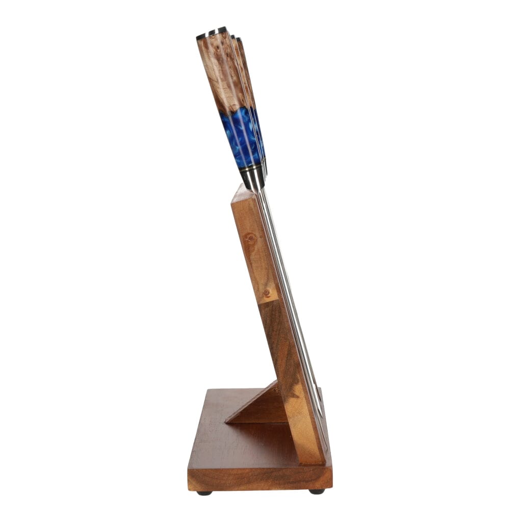 Epoxy Sapphire 6-delige Damascus Messenset + Acacia houder enkelzijdig