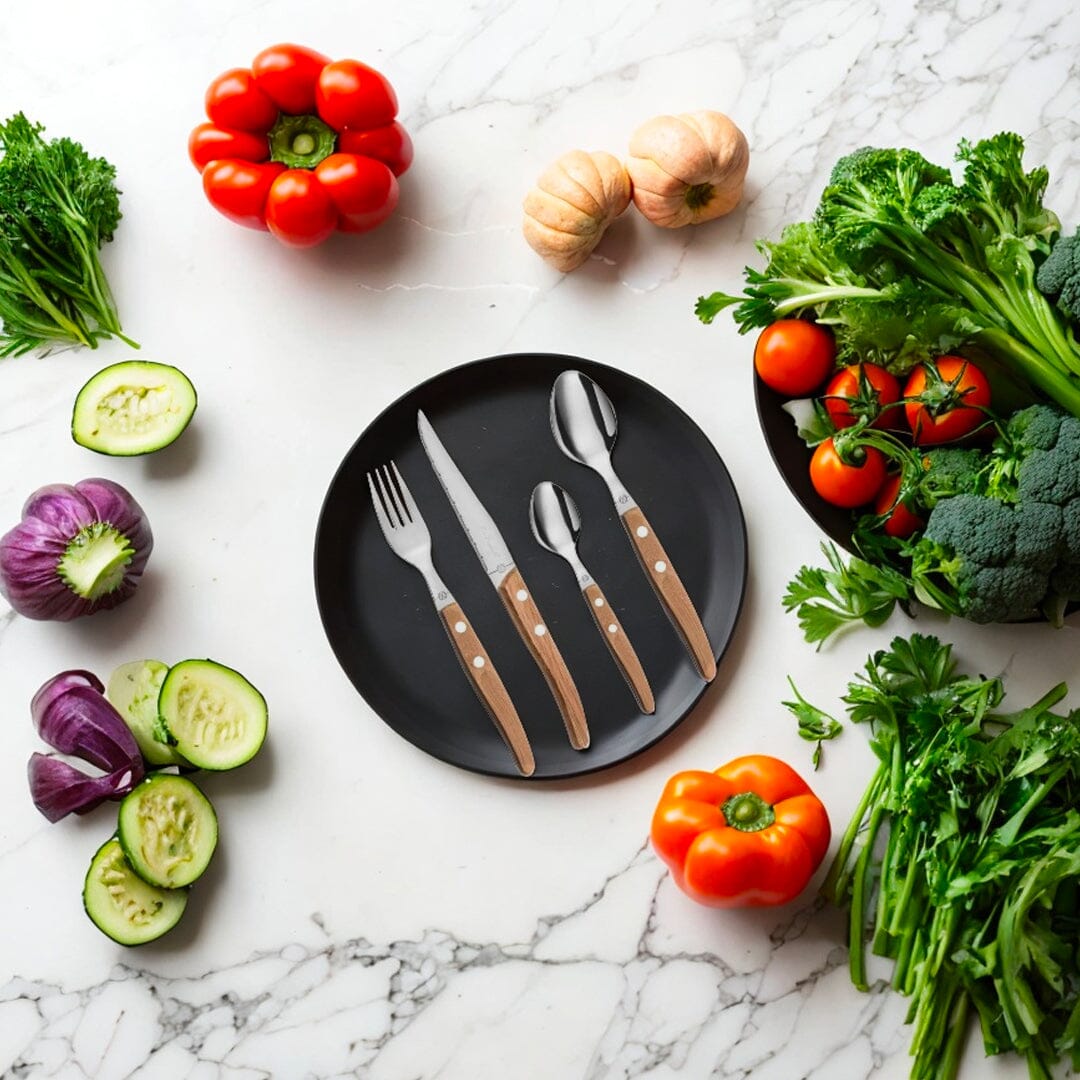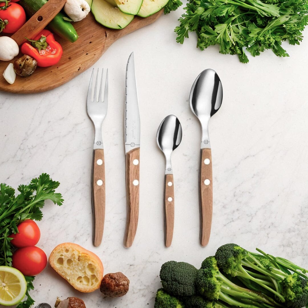The Lou Laguiole Canopée 24-piece cutlery set with wooden handles is a wonderful addition to any table. This cutlery is named after the famous French village of Laguiole, where the craft of forging high-quality cutlery has been practiced since the 19th century.