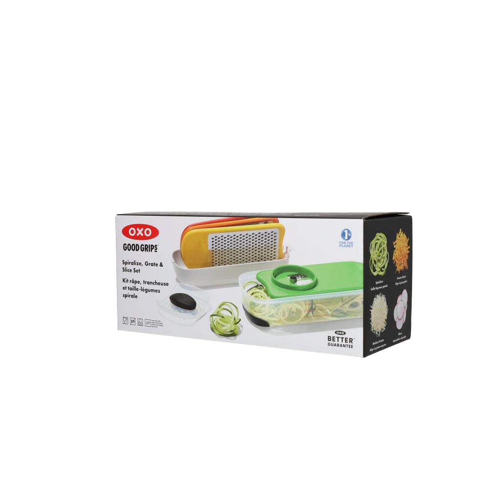 Expand your culinary horizons with the OXO Grater, Slicer and Spiral Set, an essential set for any kitchen. This versatile set combines grating, slicing and spiralizing in one handy package. The Grater, Cutting and Spiraling Set makes preparing fruit and vegetables both easy and fun.