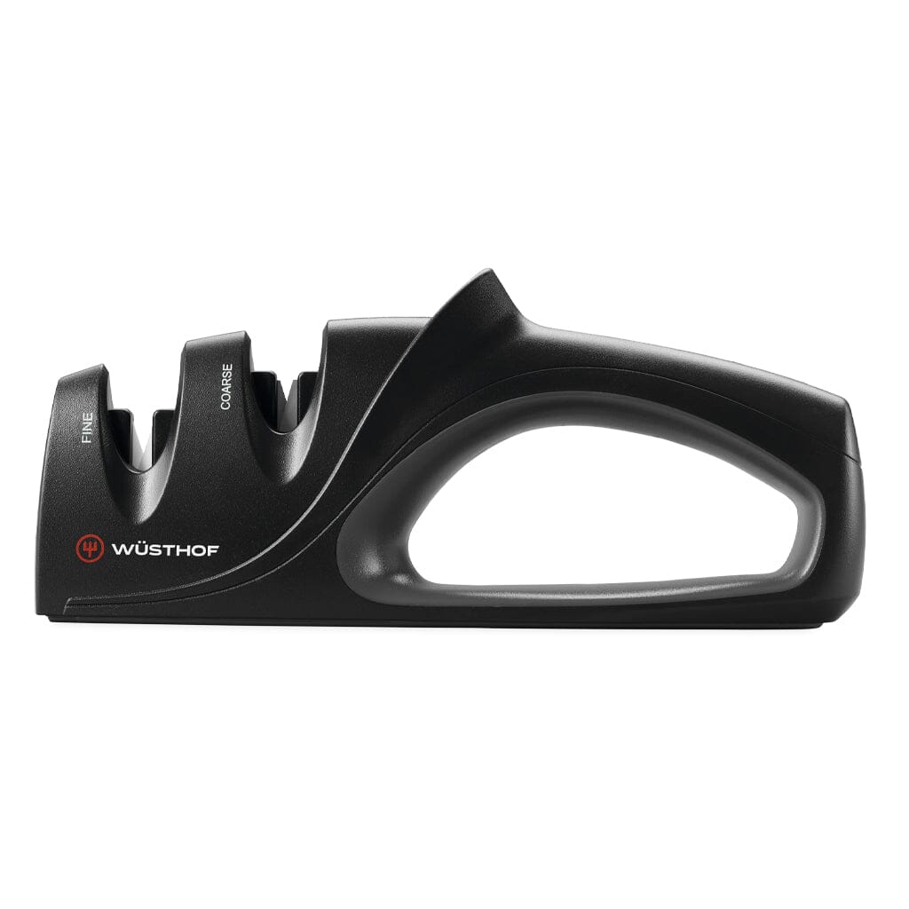 The Wüsthof Knife Sharpener, Ceramic/Carbide, has fine and coarse settings, suitable for both left- and right-handed users. For safe use, hold the sharpener firmly with your thumb in the handle to avoid injury. Gently pull the knife through the slot with downward pressure. Repeat this until you achieve the desired result: a sharp knife.